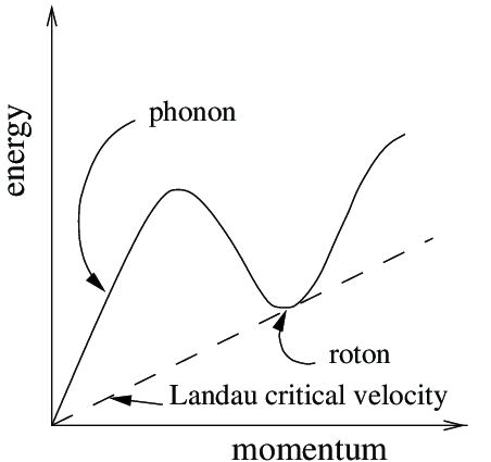 The quasiparticles of the superfluid component are described by the dispersion relation of Figure 1. Initially, there is a linear portion for low momenta. This is similar to phonon dispersion and the physical interpretation is that the helium atoms are strongly interacting and so the whole fluid moves as a solid - just like phonons.